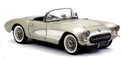 I see the same detail present in this car as I did in the 1:12th example that I reviewed in December of 2000. Debuting September of 2002, this smaller ’57 Corvette was worth the wait. Heavier, by far, than our normal diecast cars, the model exhibits no toy-like qualities. It appears fresh off the museum shelf of some automobile gallery. The doors snap shut and display no gapping. The hood opens to show off the car’s best feature, a fuel injected short block replete with standard diecast model plumbing and wiring. The air cleaner has uncommon detail for such a formal pewter-based model.