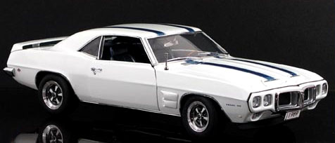 Finally, a 1:24th scale precision Trans Am diecast to die for. The first year Trans Am may be the quintessential collector car for the Firebird/Trans Am aficionado. Firebirds first debuted in 1967 but for the 1969 model year Pontiac decided to add an almost anonymous option package aimed at the Sports Car Club of America’s (SCCA) Trans Am racing series fan. Called the Trans Am Performance and Appearance Package, 689 specially equipped Polar White with blue racing stripes Pontiacs were built in coupe form. Only 8 were made as convertibles. Pontiac paid a reported license fee of $5 to the SCCA for each unit built for the use of the name, Trans Am. The Performance and Appearance Package boosted the Firebird’s price by $725. The car received a driver-controlled ram air hood with functional intakes. The reverse twin fender scoops on each side panel were also functional. They served to exhaust engine heat. The tail received a 60-inch spoiler.