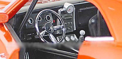 GMP and Billet specialties have teamed up to bring you the next evolution in diecast. This is the first in a new series from GMP. the 1968 Pro-Touring Camaro Z28 “Street Fighter”. Powered with a Chevy 383 Stroker power plant with aluminum heads, custom fabricated aluminum intake, modified T-56 6 speed transmission, cowl induction hood, flared front and rear fenders, all wrapped in a custom “Tangerscream” Orange metallic paint. Setting this beauty apart is the Billet Specialties SLC77 Rebel billet aluminum wheels, 18’x8” front and 18”x10”rear, and to add style to the interior, a Billet Specialties Rebel billet aluminum steering wheel. Now you can own your replica of this awesome “Street Fighter” featuring: plumbed chassis, functional steering, opening doors, hood, trunk, wired engine and gauges, racing seats, 5 point harness, roll cage, and more! Order the next evolution in diecast today!
